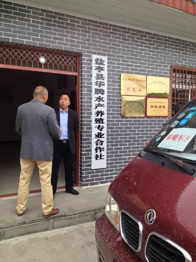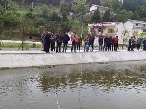 圖為考察團在麻秧鄉(xiāng)華騰水產(chǎn)養(yǎng)殖專業(yè)合作社咨詢水產(chǎn)品種引進事宜。