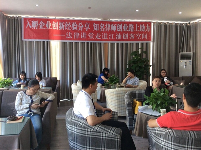 2016年5月18日,江油市創(chuàng)客空間攜太白律師事務(wù)所在創(chuàng)客咖啡舉行入孵企業(yè)法律知識(shí)講座及企業(yè)創(chuàng)新經(jīng)驗(yàn)的分享。參加本次講座的有綿陽(yáng)悟空科技有限公司、江油弘云科技有限公司、綿陽(yáng)煥然科技有限公司、江油歡喜小子網(wǎng)絡(luò)科技有限公司等十余家企業(yè)。